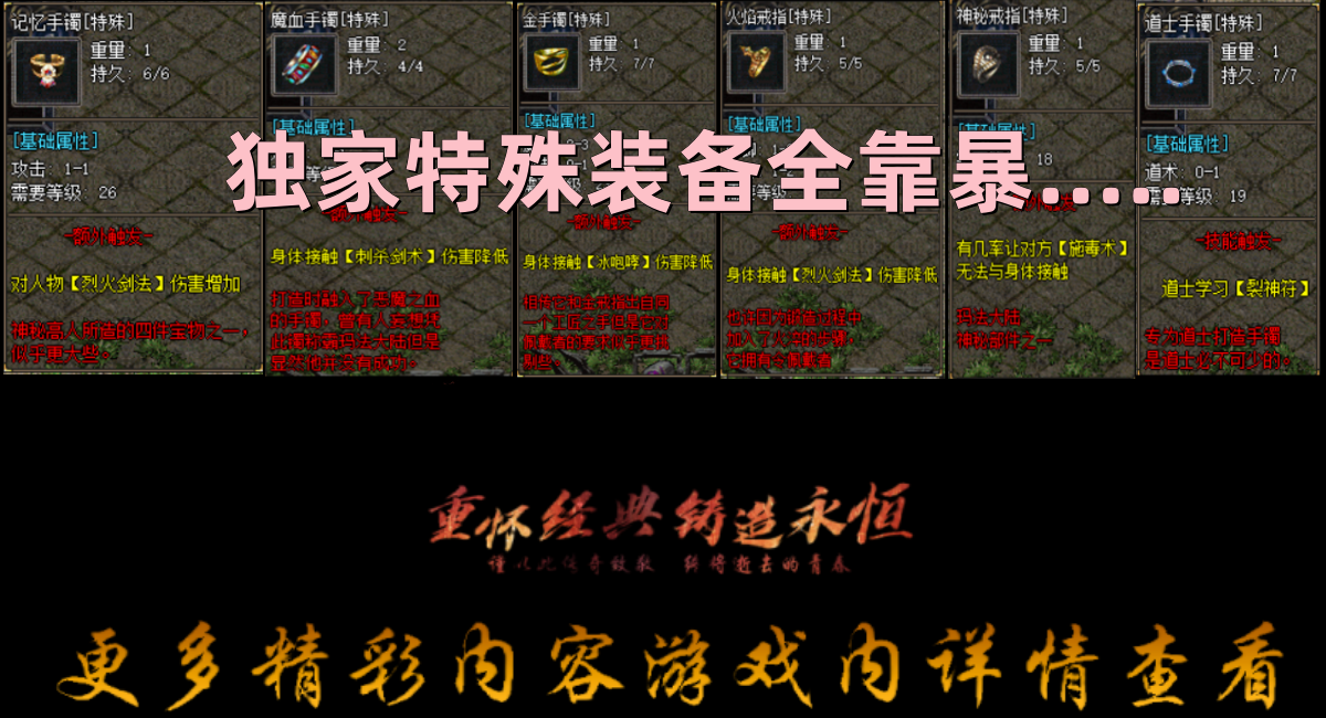 终极武器:屠龙-嗜魂法杖-霸者之刃,终极首饰:圣战-法神-天尊-独家1.76特殊首饰(增加伤害等等)